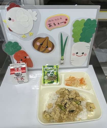 今日の献立は、親子丼(ごはん)、紅白なます、まっ茶大豆、牛乳です。