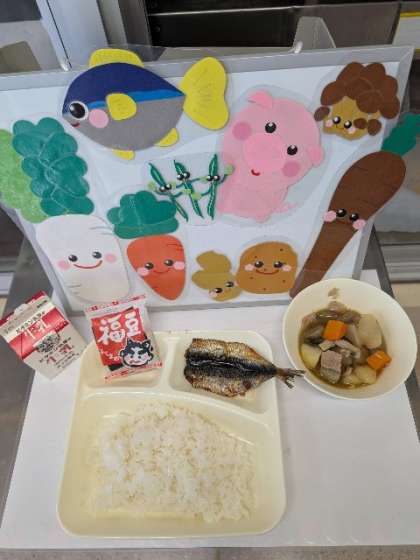今日の献立は、いわしのしょうがじょうゆかけ・含め煮・入り大豆・ごはん・牛乳です。