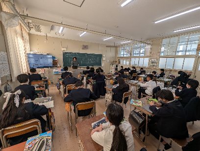 社会科の授業の様子です。情報産業の学習をしていました。天気情報の活用について考えていました。天気情報を、ビジネスにどう活用するのかの意見を出し合っていました。皆さんは思いつきましたか?