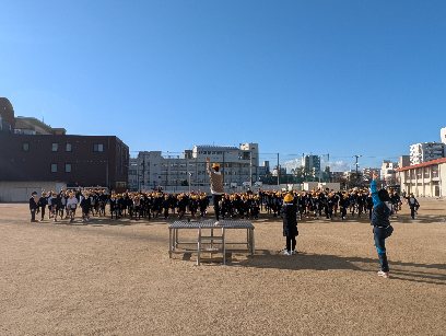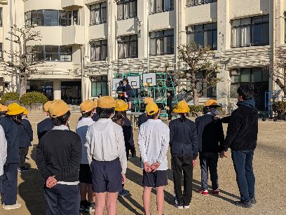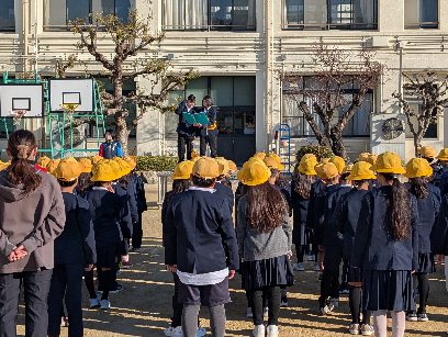 運動場で全校朝会を行いました。運動委員会の姿勢ストレッチに続いて、校長先生からお話がありました。その後で、看護当番から、先週の反省と今週の目標についての話がありました。