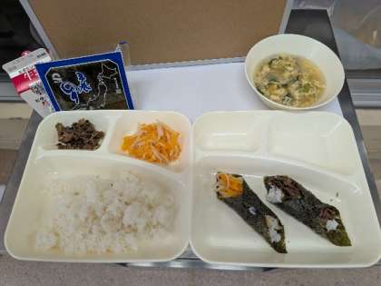 今日の献立は、キンパ(肉・ナムル)・焼きのり(手巻き)・卵の中華スープ・牛乳です。