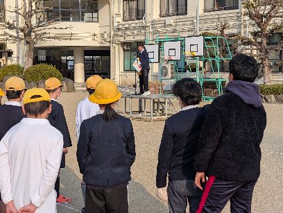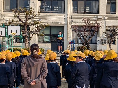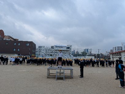 運動場で全校朝会を行いました。運動委員会の姿勢ストレッチの後に、校長先生からお話がありました。続いて、看護当番から、先週の反省と今週の目標についての話がありました。