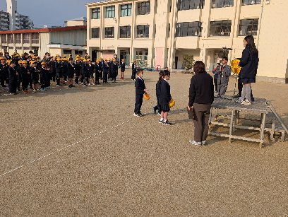 最後に、図書委員会から、はやくも読書ビンゴをした人に記念品が贈られました。また、放送委員会から、世界のあいさつについてのお知らせがありました。