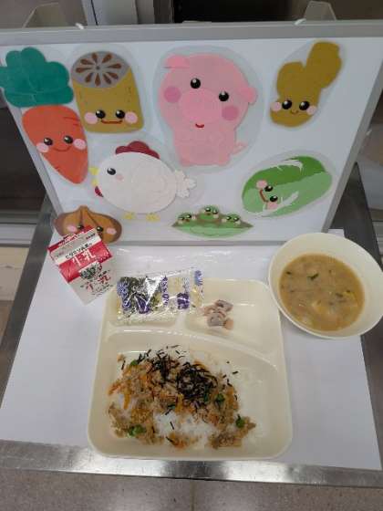 今日の献立は、鶏ごぼうご飯(きざみのり)・みそ汁・焼きれんこん・牛乳です。