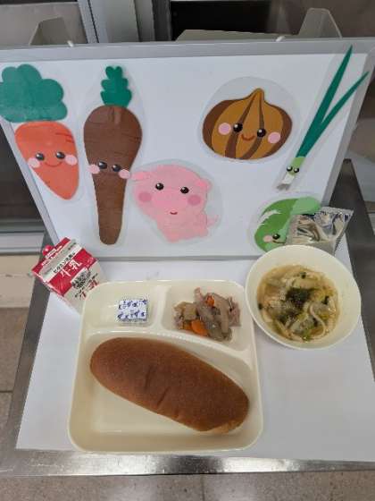 今日のメニューは、豚肉とごぼうの煮もの・なにわうどん(とろろこんぶ)・固形チーズ・黒糖パン・牛乳です。