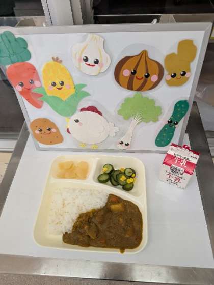 今日の献立は、チキンレバーカレーライス・きゅうりとコーンのサラダ・洋なし(カット缶)・牛乳です。