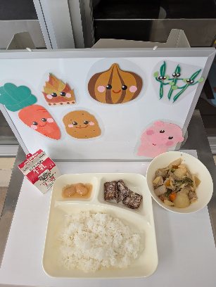 今日の献立は、くじらのたつたあげ・豚肉とじゃがいもの煮もの・白花豆の煮もの・ごはん・牛乳です。くじらの竜田揚げは、かりっと揚がり、中は柔らかくおいしかったです。豚肉とじゃがいもの煮物は、しっかり柔らかく煮られおいしかったです。白花豆の煮物は、甘く柔らかくおいしかったです。