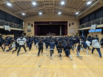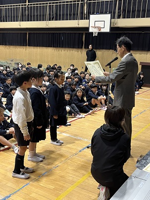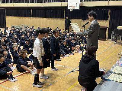 雨のため、講堂で全校朝会を行いました。運動委員会の姿勢ストレッチに続いて、児童絵画展の入賞者の表彰を行いました。