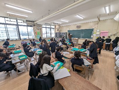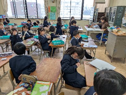 図画工作科の授業の様子です。ステンシル版画をしていました。下描きした動物を切り出していました。切ったものを台紙に貼り付けていきます。どこに配置するかも重要ですね。