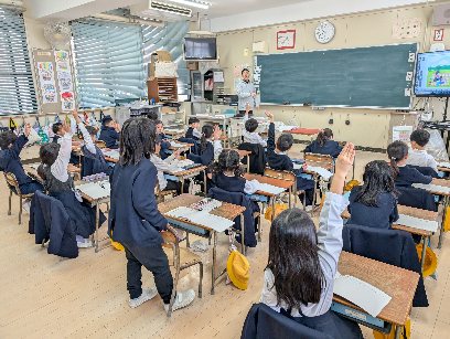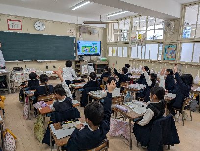 算数の授業の様子です。大きさ比べの学習をしていました。2つのレジャーシートを比べ、大きいほうは、どちらかを考えていました。図形の学習につながっていく単元ですね。子ども達は、理由を挙げて大きいほうを選んでいました。