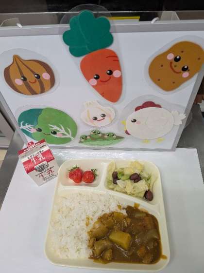 今日の献立は、チキンカレーライス・ビーンズサラダ・いちご・ごはん・牛乳です。カレーにはチキンがいっぱい入っていて、大きなじゃがいももあっておいしかったです。サラダに豆が入ったら、食べ応えがあっておいしかったです。このメニューにいちごがつくんです。幸せでした。