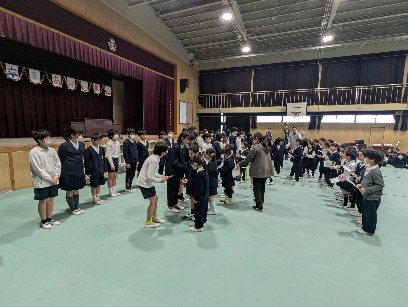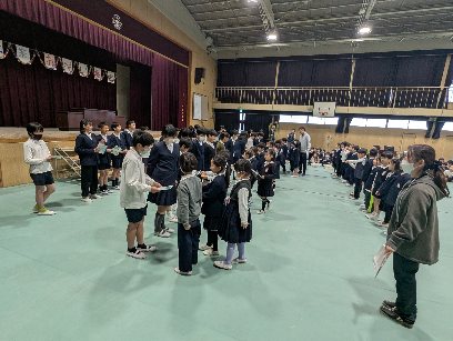 続いて、在校生から6年生にメッセージカードが贈られ、6年生からは各学級にプレゼントが贈られました。