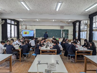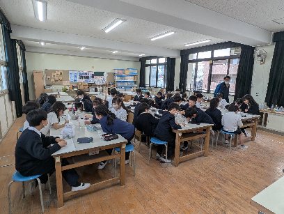 理科の授業の様子です。理科室で水の実験をしていました。水と氷の量を比べていました。身近で氷を得ることができるので、かさが変わるのは知っている子が多いのかな。どれくらい増えるのかをしっかり調べましょう。