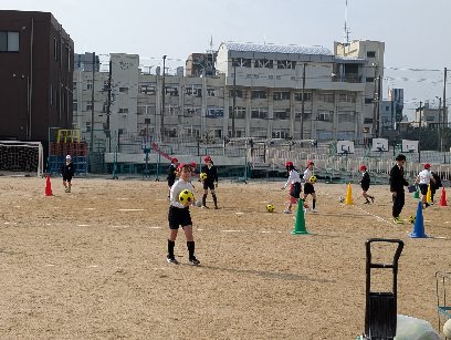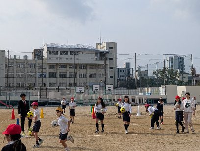 体育の授業の様子です。運動場でボールをける運動をしていました。パスやシュートの練習をしていました。サッカーの試合をするのが楽しみですね。