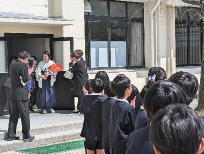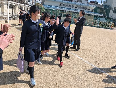 教室での別れを済ませ、晴天の運動場で多くの方の祝福の拍手に包まれて、卒業生は旅立っていきました。本当に素晴らしい卒業式になりました。来賓・地域・PTA・在校生・教職員の皆さん。本当にありがとうございました。