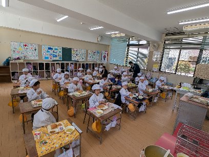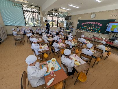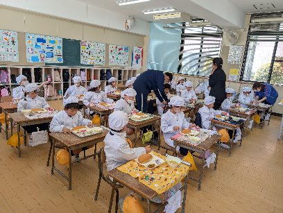 給食の様子です。小学校での初めての給食ですね。煮込みハンバーグは、柔らかく味もよくおいしいです。みんなで楽しくしっかりいただきましょう。