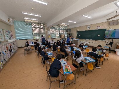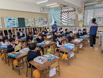 算数の授業の様子です。算数セットの中身を点検していました。これから1年間、算数の時間に色々なものを使います。大切にしましょうね。
