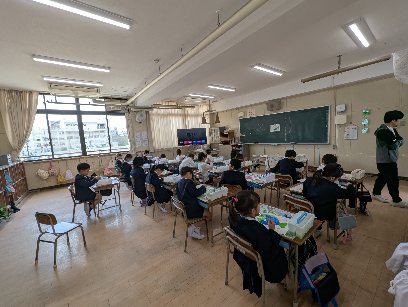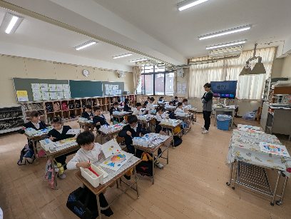 図画工作科の授業の様子です。絵の具を使って絵を描いていました。初めて絵の具を使うので、先生の指示をよく聞いて、濃く描いたり薄く描いたり、色のグラデーションを楽しんでいました。みんなとっても上手に描けていました。