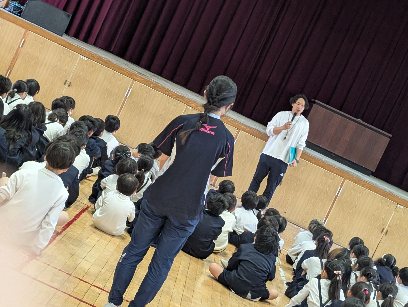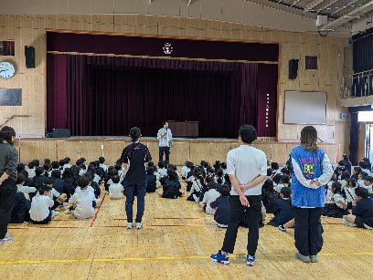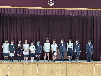 講堂で全校朝会を行いました。校長先生のお話の後に、学級代表・委員会委員長の認証式を行いました。最後に看護当番の先生から先週の反省と今週の目標についてのお話がありました。