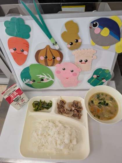 今日の献立は、豚肉のしょうが焼き・とうふのみそ汁・じゃこピーマン・ごはん・牛乳です。