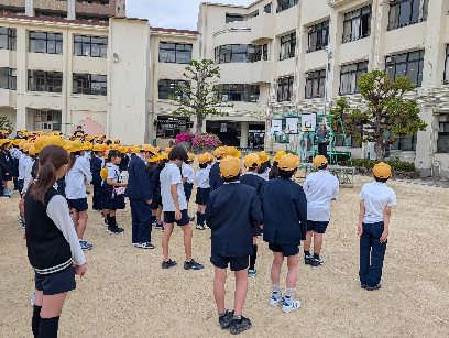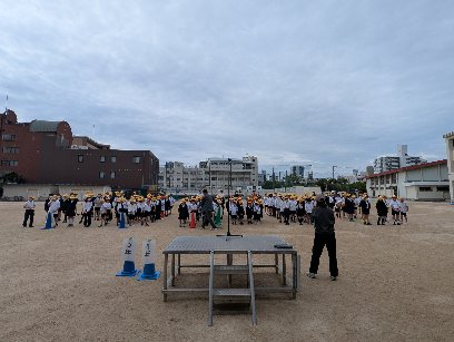 運動場では初めての、全校朝会を行いました。校長先生のお話の後、看護当番の先生から先週の反省と今週の目標についてのお話がありました。
