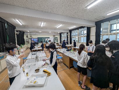 理科の授業の様子です。空気の燃焼実験をしていました。物を燃やす前と後の空気の変化を調べてい火を使う実験使う実験なので、慎重に安全に行っていました。