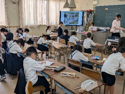 図画工作科の授業の様子です。運動会に掲示する旗の絵を描いていました。みんな思い思いに作品を描いていました。運動会が近づくとピロティに掲示しますのでご覧になってください。