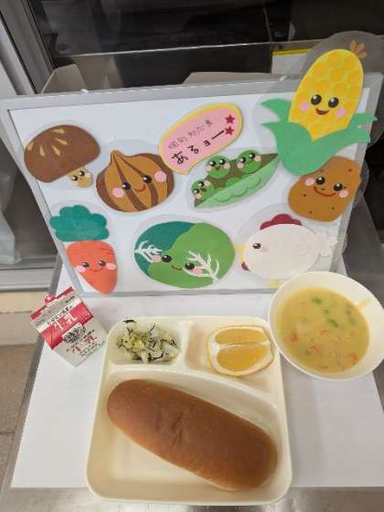 今日のメニューは、鶏肉とコーンのシチュー・キャベツのひじきドレッシング・かわちばんかん・黒糖パン・牛乳です。