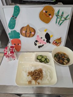 今日の献立は、肉じゃが・きゅうりの酢のもの・ごまかかいため・ごはん・牛乳です。