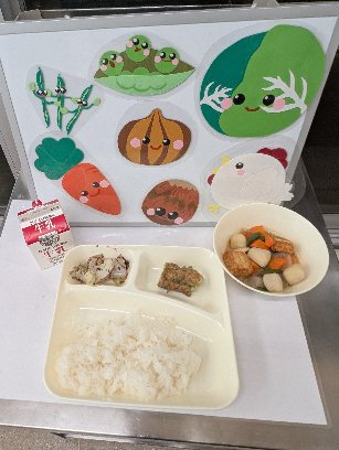 今日の献立は、ちくわのいそべあげ・あつあげとさといものみそ煮・キャベツの赤じそあえ・ごはん・牛乳です。