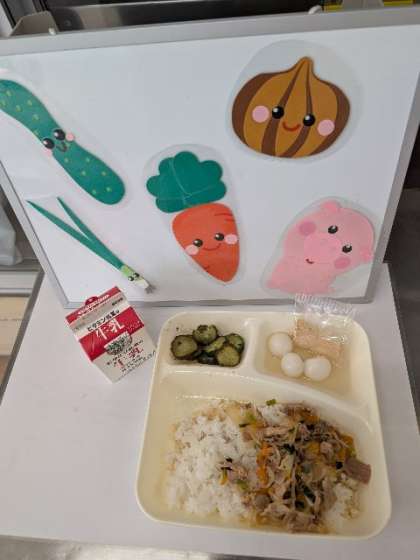 今日の献立は、豚丼・きゅうりのかつお梅風味・白玉だんご(きなこ)・牛乳です。