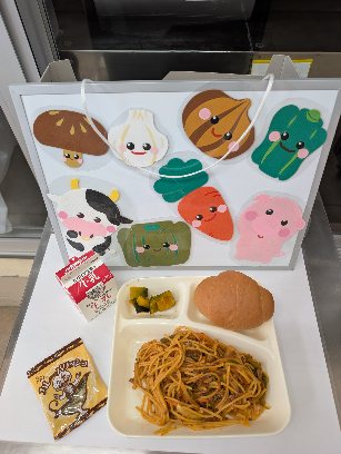 今日のメニューは、ミートソーススパゲッティ・焼きかぼちゃ・カレーフィッシュ・ミニコッペパン・牛乳です。
