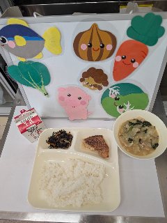 今日の献立は、あかうおのしょうゆだれかけ・みそ汁・ひじきのいため煮・ごはん・牛乳です。
