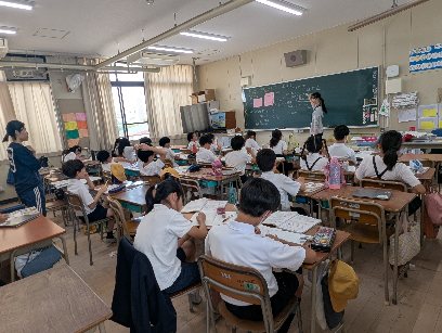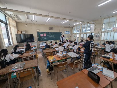 算数の授業の様子です。面積・体積を小数を使って求めていました。実習生が指導をしていました。先生も子ども達も、みんなががんっばているという熱意が伝わってきました。とても素晴らしい、いい学級ですね。