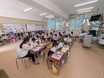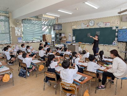 国語の授業の様子です。カタカナの学習をしていました。習ったカタカナをワークブックに書いていました。「ク」を書いていました。書き順も手を使って覚えていました。書き順は、忘れないようにしましょうね。