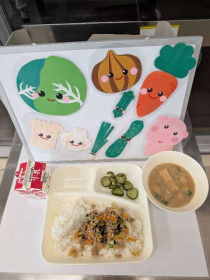 今日の献立は、豚ひき肉とにらのそぼろ丼・みそ汁・きゅうりのゆず風味・牛乳です。
