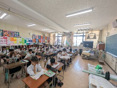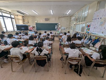 道徳の授業の様子です。「さち子のえがお」を題材にして「善悪の判断」について学習していました。子ども達は、正しいと判断ことは、自信をもって行うことの大切さについて考えていました。