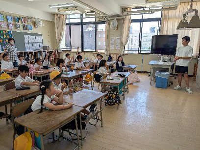 国語の授業の様子です。句読点の打つ位置で意味が変わる文章の学習をしていました。「ヒーローばんぐみをみる」の文に句点をつけると、「ヒーロー、ばんぐみをみる」「ヒーローばんぐみを、みる」で、違いますよね。他にもいろいろ考えられます。皆さんも考えてみましょう。