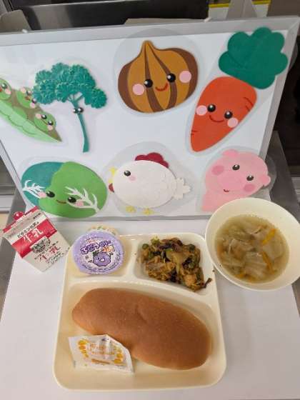 今日のメニューは、カレーマカロニグラタン・てぼ豆のスープ・ぶどうゼリー・牛乳です。