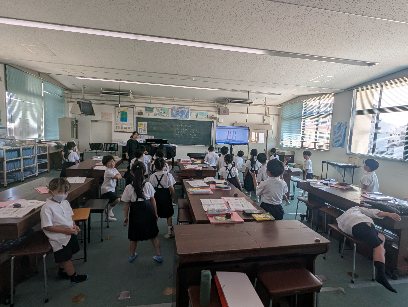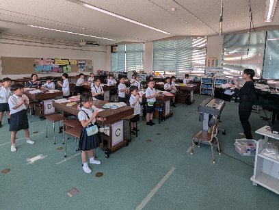 音楽の授業の様子です。曲に合わせてカスタネットを打ちながら、歌っていました。カスタネットをたたきながら笑顔で元気に歌っていました。校歌もカスタネットを打ちながら歌っていましたよ。みんな楽しそうでした。