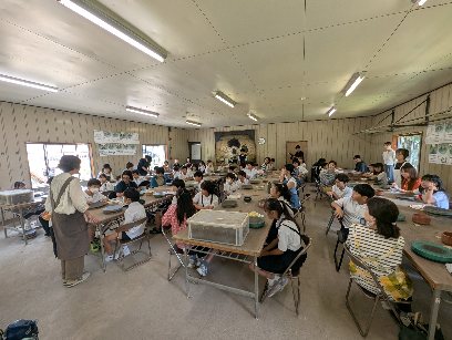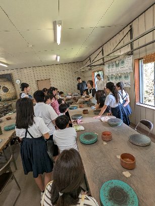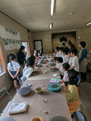 陶芸教室が始まりました。作り方の説明を聞いています。
