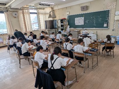 外国語活動の授業の様子です。アルファベットの書き方の学習をしていました。ていねいにていねいに、1文字ずつ書いていました。漢字と同じで、アルファベットも一生使うので、しっかり書き方を覚えておきましょう。
