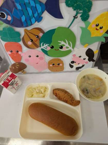 今日のメニューは、サーモンフライ・豆乳スープ・キャベツのゆずドレッシング・パンプキンパン・牛乳です。