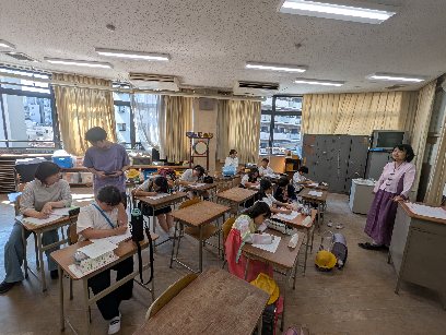 今日の民族クラブは、チョゴリについて学びました。2人の子どもがチマチョゴリとパヂチョゴリを試着しました。その後に、チョゴリの挿絵を着色しました。いろいろな色を使って、カラフルなチョゴリができました。