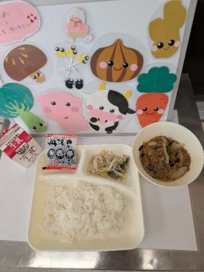 今日の献立は、マーボーはるさめ・いり黒豆・チンゲンサイともやしの甘酢あえ・ごはん・牛乳です。