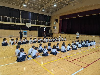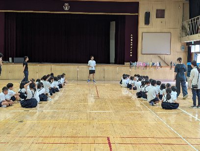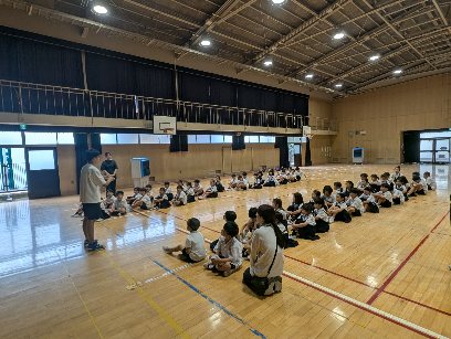 体育の授業の様子です。急な激しい雨で、プール開きが延期になりました。そこで講堂で、プール学習のルールなどを話し合っていました。学年混合でバディを決めて、プール内での注意することを話し合っていました。