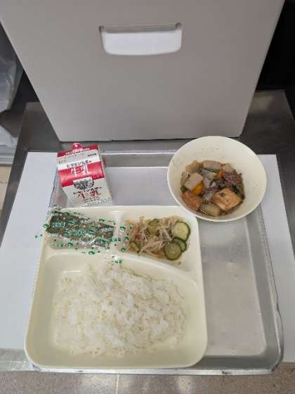今日の献立は、牛肉と野菜のいため煮・きゅうりともやしのおひたし・焼きのりです。