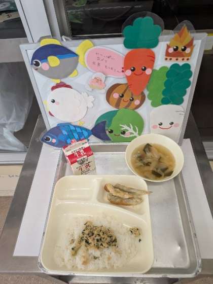 今日の献立は、いわし天ぷら・五目汁・とりなっ葉いため・ごはん・牛乳です。