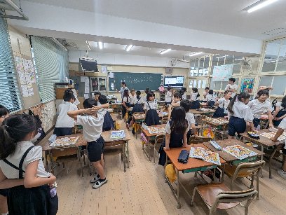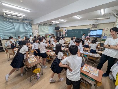 外国語活動の授業の様子です。数字の学習をしていました。少人数のグループで、ゲーム形式で数を英語で答えていました。とても盛り上がり楽しそうでした。