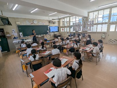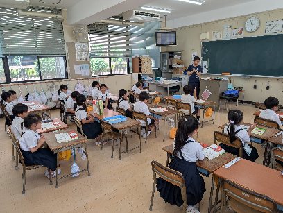 国語の授業の様子です。長音の学習をしていました。おばあさんやおにいさんのように、母音を伸ばして発音する音の学習でした。手拍子でリズムをとりながら、大きな声で読んでいました。伸ばす音もしっかり覚えておきましょう。
